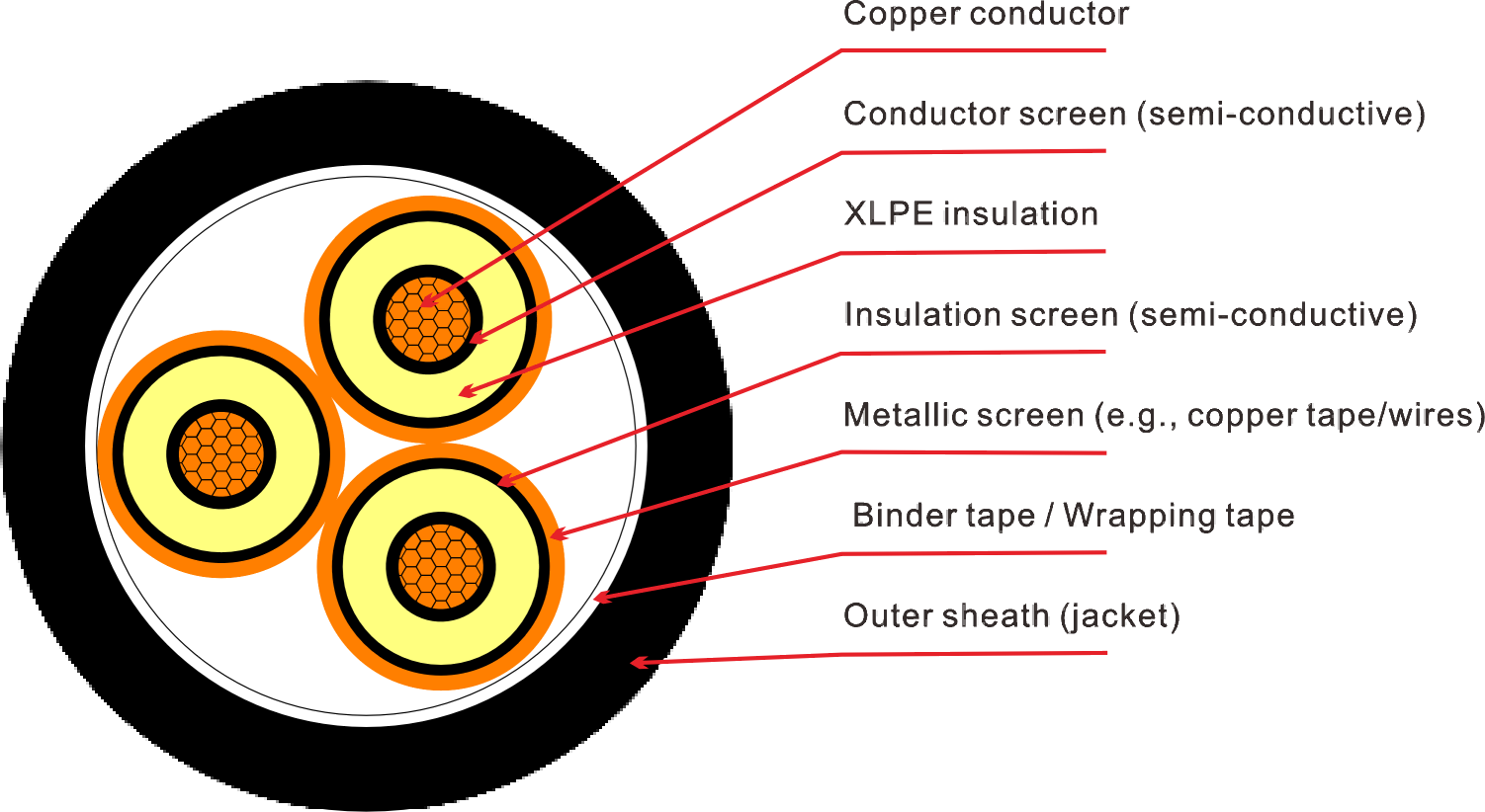 Кабели среднего напряжения TK Group предназначены для распределительных сетей напряжением 6–35 кВ и оснащены медно-алюминиевыми проводниками, изоляцией из сшитого полиэтилена (XLPE), полупроводящими экранами и металлическим экраном. Кабели рассчитаны на длительную эксплуатацию при температуре до 90 °C. Возможны варианты исполнения с броней STA/SWA и огнестойкой оболочкой LSZH, соответствующей стандартам IEC 60502-2 и GB/T 12706.