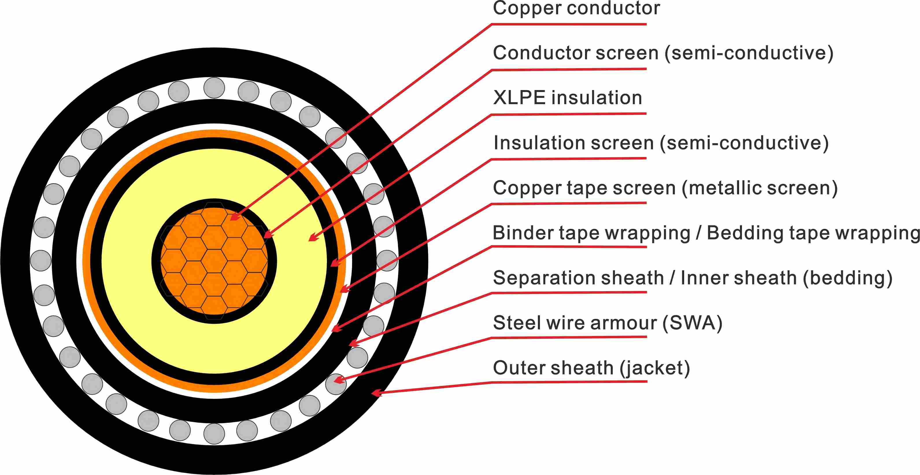 Типичная конструкция (одножильный, с изоляцией из сшитого полиэтилена, экранированный, бронированный)